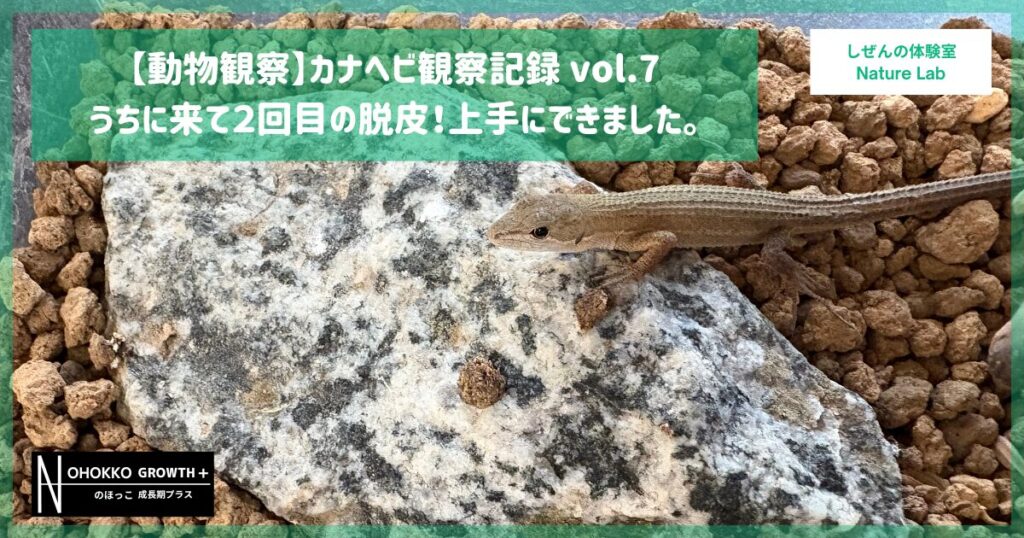 子供についても、カナヘビのカナちゃんの脱皮には興味があったらしく、今回は胴部分から抜けて、手足もしっかり脱皮できていたとのこと、皮も手の形でとれていたよと言って、脱皮の皮を取っていてくれました。しっぽはまだかもしれないということでした。たぶんしっぽは最後に脱皮するよと子ども的に考察をしていたようです。